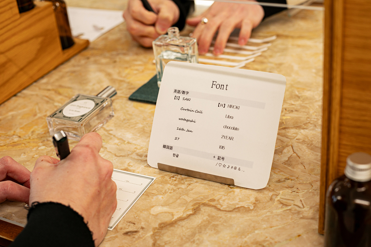 「ann fragrance」では、香りの名前も自分で考えることができます。自分で考えた香りの名前をラベルに印字してもらえるなんて素敵!文字数の制限はなく、2行にすることも可能。ギフトで渡す場合はメッセージにすることもできます。使える文字は英語と韓国語で、記号もパソコン上にあるものであれば使うことができます。フォントは2種類。