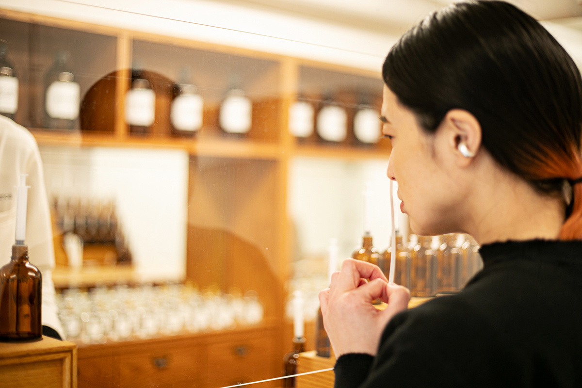 2つのベースの香りの調合を変えることはもちろん、ほかに選んだ3つの香りを混ぜたらどうなるのかも試してもらえます。数種類の香りを嗅ぎ、「これはイメージと違う」というものを外していきます。それを見て調合師が、好みの傾向からより自分の好みにあったものを提案してくれます。「試してみたい場合は、いくらでもおっしゃっていただければ。ゆっくりで大丈夫ですよ」。気軽に話せるので、こちらもリクエストを伝えやすい雰囲気です。香りを嗅いでいる間も、その香りに対するアドバイスを丁寧にしてもらえます。