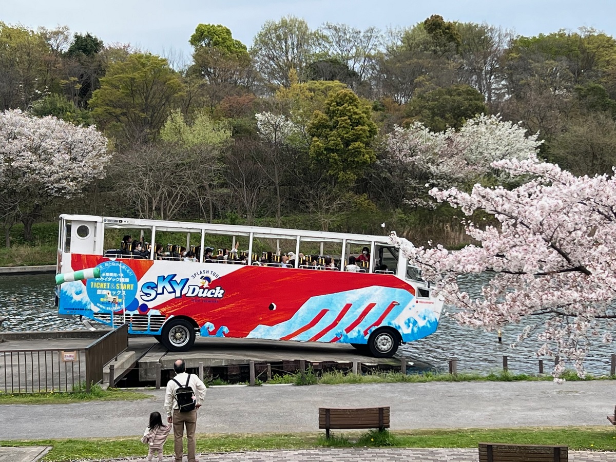 旧中川は水陸両用バス「SKY Duck」の運行コースの一部になっていて、「旧中川・川の駅」には入出水するスロープがあります。週末の運行時間にはスロープから水しぶきをあげて川にダイブする瞬間が見られますよ。