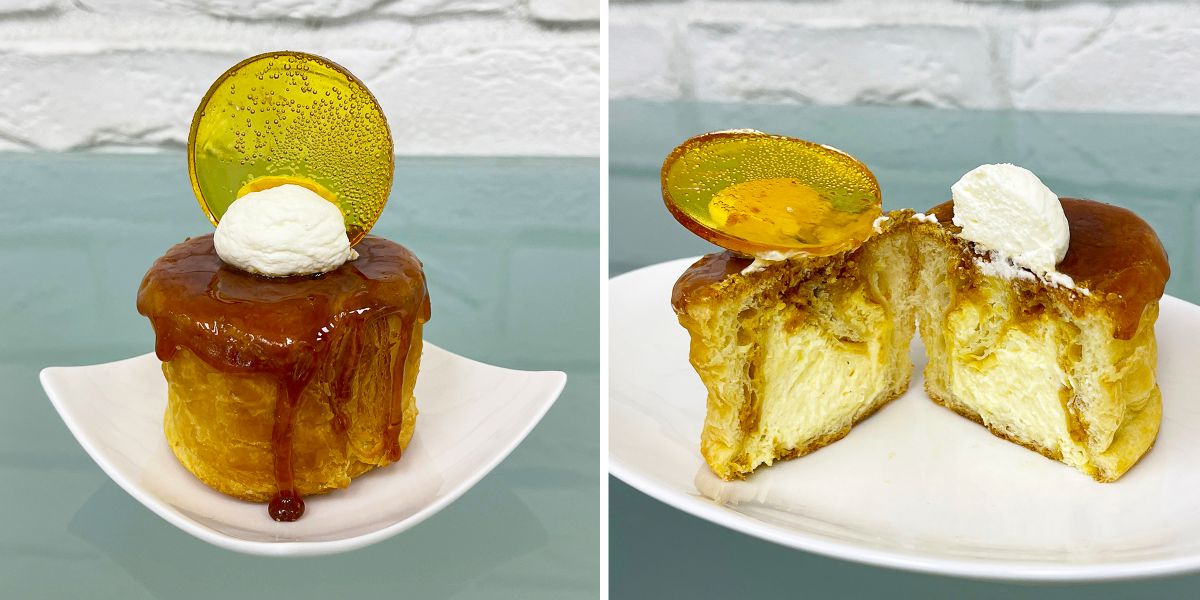 発酵バターを使用し、丸い形に焼き上げられたクロワッサン生地の中にはカスタードクリームがたっぷり。カラメルソースも入っているため、本当にプリンのような味わいです。
