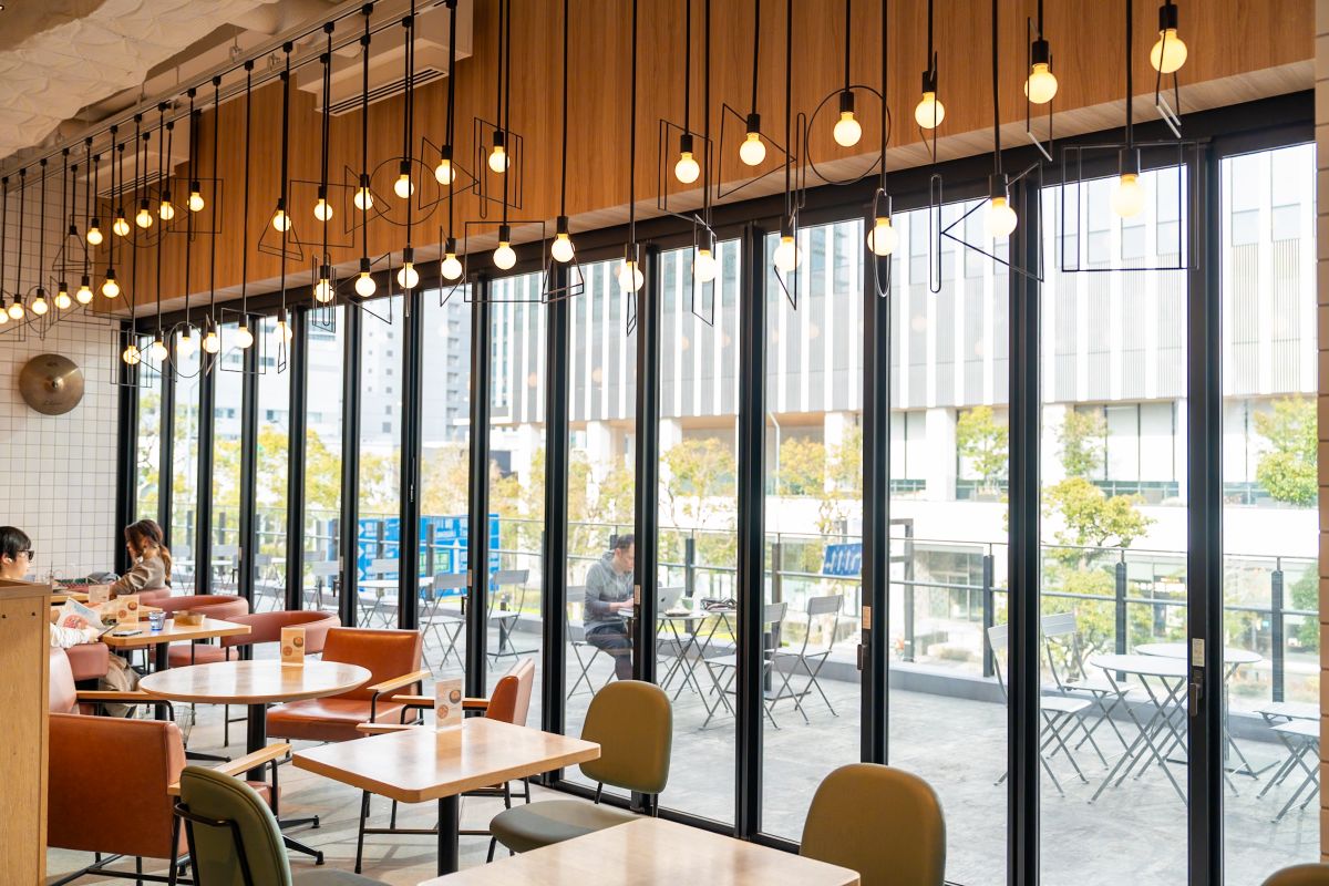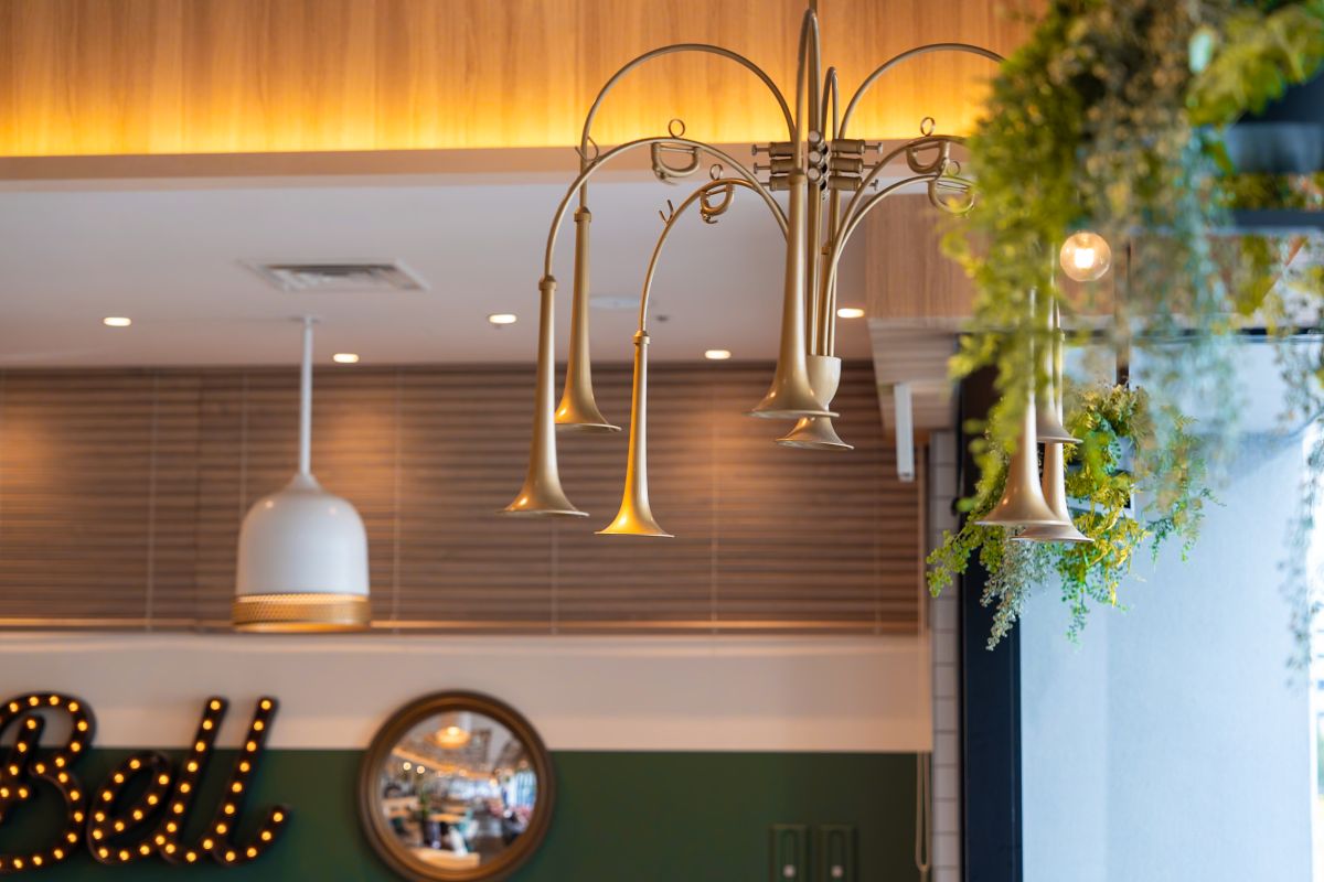 アーティストのライブなどが行われる「ぴあアリーナMM」にあることから、店内にはトランペットを模した照明など、楽器にまつわるインテリアが。趣向を凝らした店内デザインにセンスを感じます。