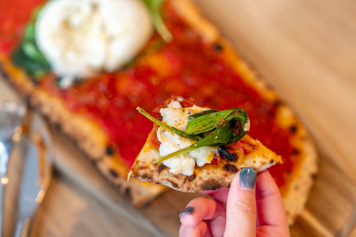 まずオーダーしたい注目メニューがこちらの「NY BOARD PIZZA」。国産レンガを使用した本格特注窯で焼き上げるのは、NYで人気だという細長い形のボード型のピザ。写真は中央にブラータチーズがどんとのったインパクトのある「ビーフラグー/ブラータチーズ」Lサイズ2000円、Mサイズ1700円(写真はLサイズ)。