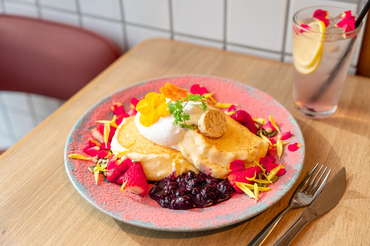 カフェメニューまたはデザートでオーダーしたいのは、お店一番人気のパンケーキ。「ドレッシー(華やかに着飾る)」をテーマにしたパンケーキは全3種で、「フレッシュレッド」1700円、「サワーグリーン」、「ローステッドブラウン」各1600円とそれぞれメインのカラーごとにデザイン、盛り付けされているのが特徴。写真は赤をテーマにした「フレッシュレッド」で、季節のエディブルフラワーやイチゴ、ベリーを使用したシグネチャーパンケーキです。