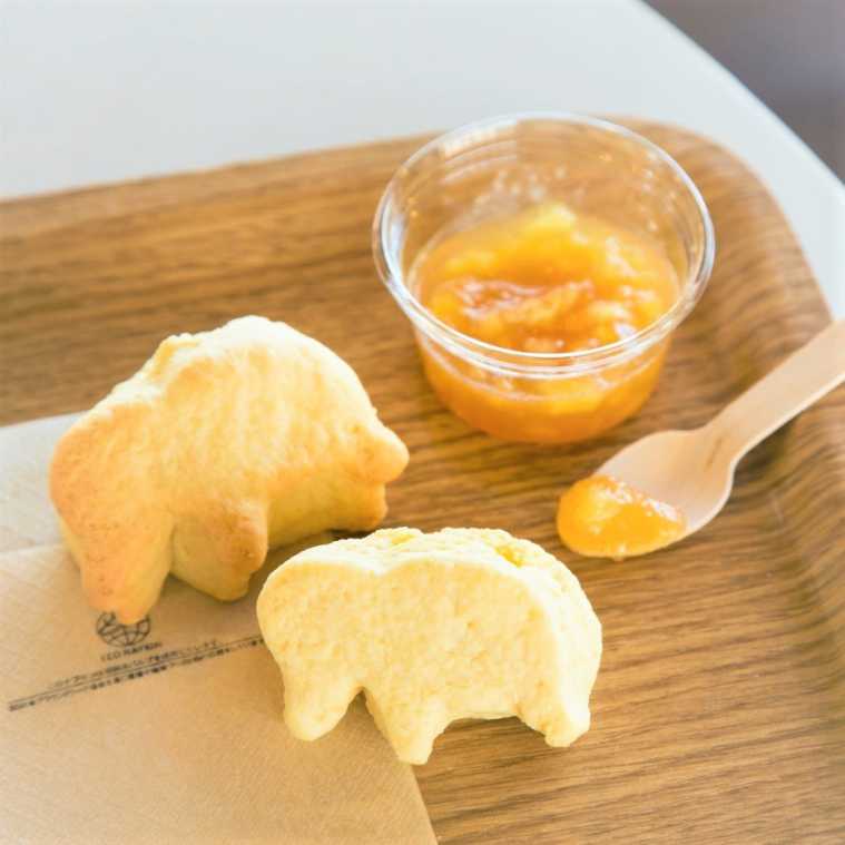 ひと口サイズのスコーン(480円)も、やっぱりゾウ!焼き色や膨らみ加減で微妙に形が違うことすら、なんだかカワイイ。トッピングのジャムは季節によって替わります。