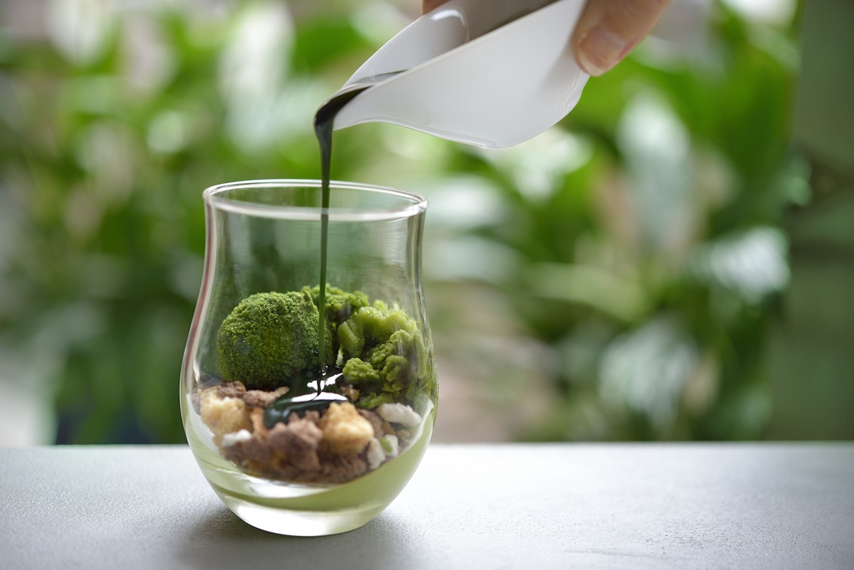 苔玉のテラリウムをイメージしたグラスパフェ。抹茶とホワイトチョコレートのムースに、ザクザクとした食感が楽しめるクランブルのほか、ビターチョコレートとホワイトチョコレート、濃淡をつけた2色の抹茶あん、パンナコッタをのせて世界観を表現。 苔玉を模したパンナコッタは味のアクセントとしてライムとレモンピールを閉じ込めたさわやかな一品で、お口直しにもぴったり。お好みで「辻利兵衛本店」のレシピで作るお濃茶ソースをかけて、宇治抹茶の味わいを存分に楽しむことができます。