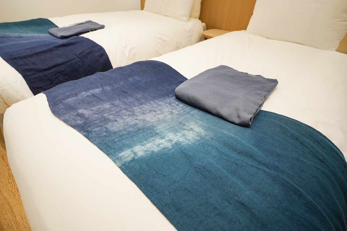 TSUKIのテーマカラーである藍色をベースにした落ち着きのあるインテリアで、ベッドスローはホテル特注の藍染だそう。日本の伝統文化である藍染に触れて、日本をもっと知ってほしいという思いが込められています。