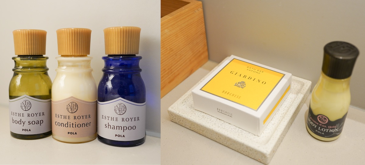 アメニティはシャンプー、コンディショナー、ボディソープ、ボディローション、クレンジング、歯ブラシ、ヘアブラシ、ヘアゴム、シャワーキャップ、コットンなどひと通り揃っています。バスグッズは持参しなくても問題なく滞在できるので便利です。