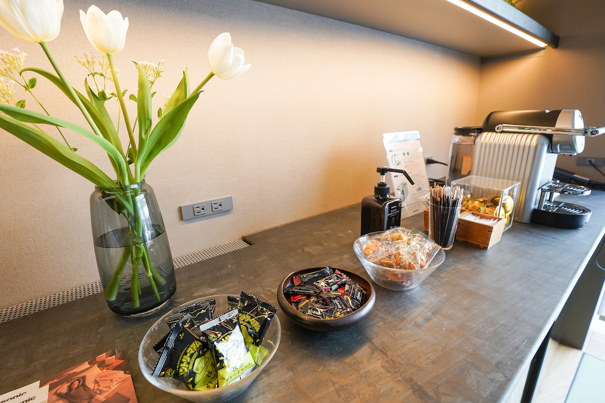 「YUAGARI」には大きなソファベッドに本棚、フットマッサージャー、そしてドリンク類やお菓子まで!本棚には、だしや庭園に関するものなど、日本の魅力を伝える本が並んでいます。