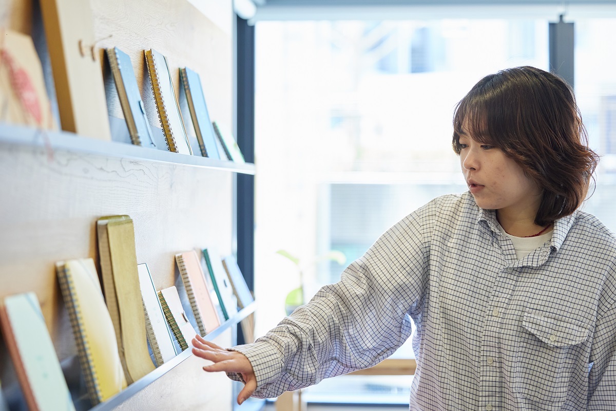 店内は明るく開放的な雰囲気。壁面には手作りノートがディスプレイされています。いつもパソコンやスマホの画面ばかり見ているので、カラフルなノートに囲まれたアナログな空間が、新鮮に感じられます!