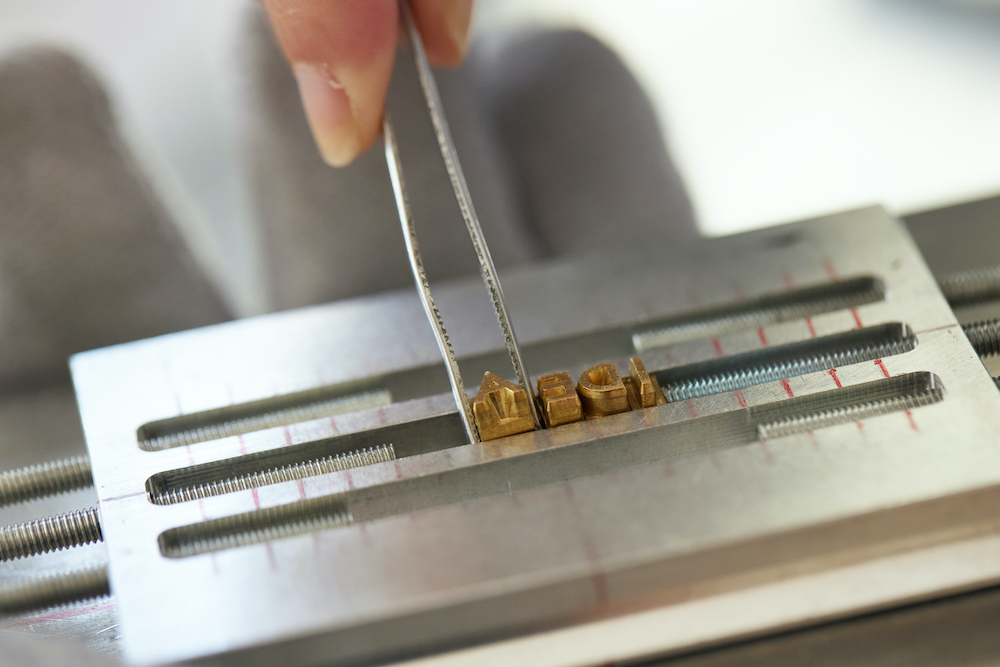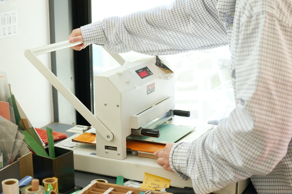 紙類を用意したら、続いて表紙の文字入れ作業。「IDEA」の金属型を専用の加工台にセットします。