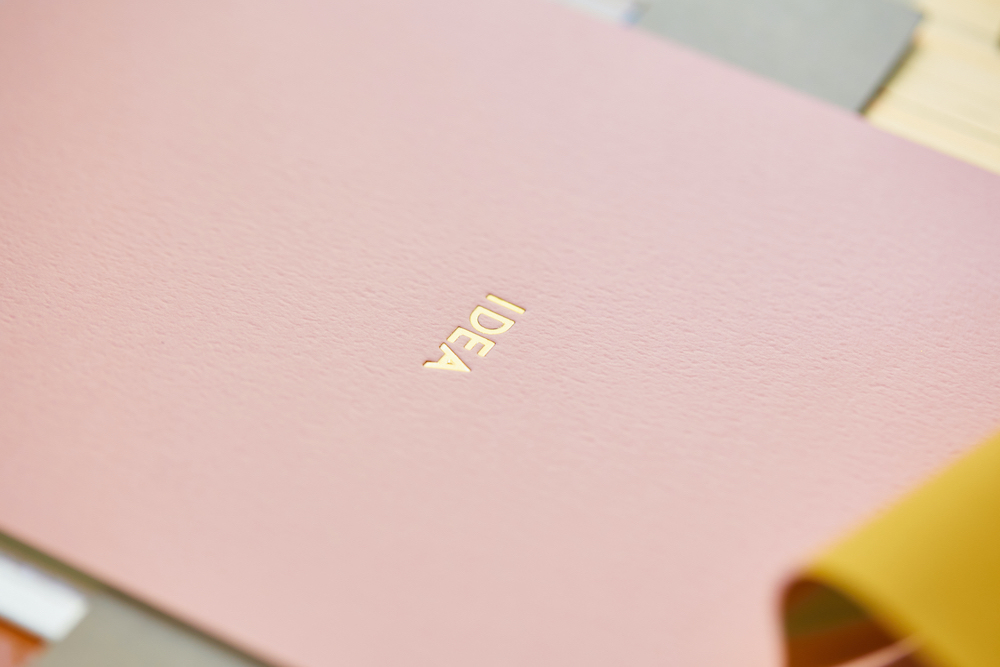 「IDEA」の文字が表紙に印字されました!文字入れ部分は微妙に凹凸感があり、印刷とは異なる重厚でリッチな雰囲気。金色の文字が輝いて見えます。