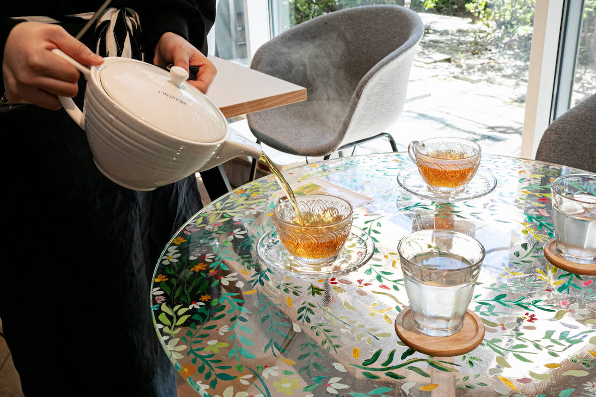 「ティーフリー」は、約10分おきにスタッフの方が客席をまわり、よきタイミングを見計らって注いでくれます。ちなみにお店の方いわく、「ティーフリー」で一人が飲む平均カップ数は約8~10杯とのこと。え、そんなに!?と驚いたものの、1杯ごとに趣向の異なるフレーバーで、かつ、2杯目以降はティーカップの3分の1程度に少量ずつ注いでくれるので、無理なくいろいろなフレーバーティーを味わうことができます。