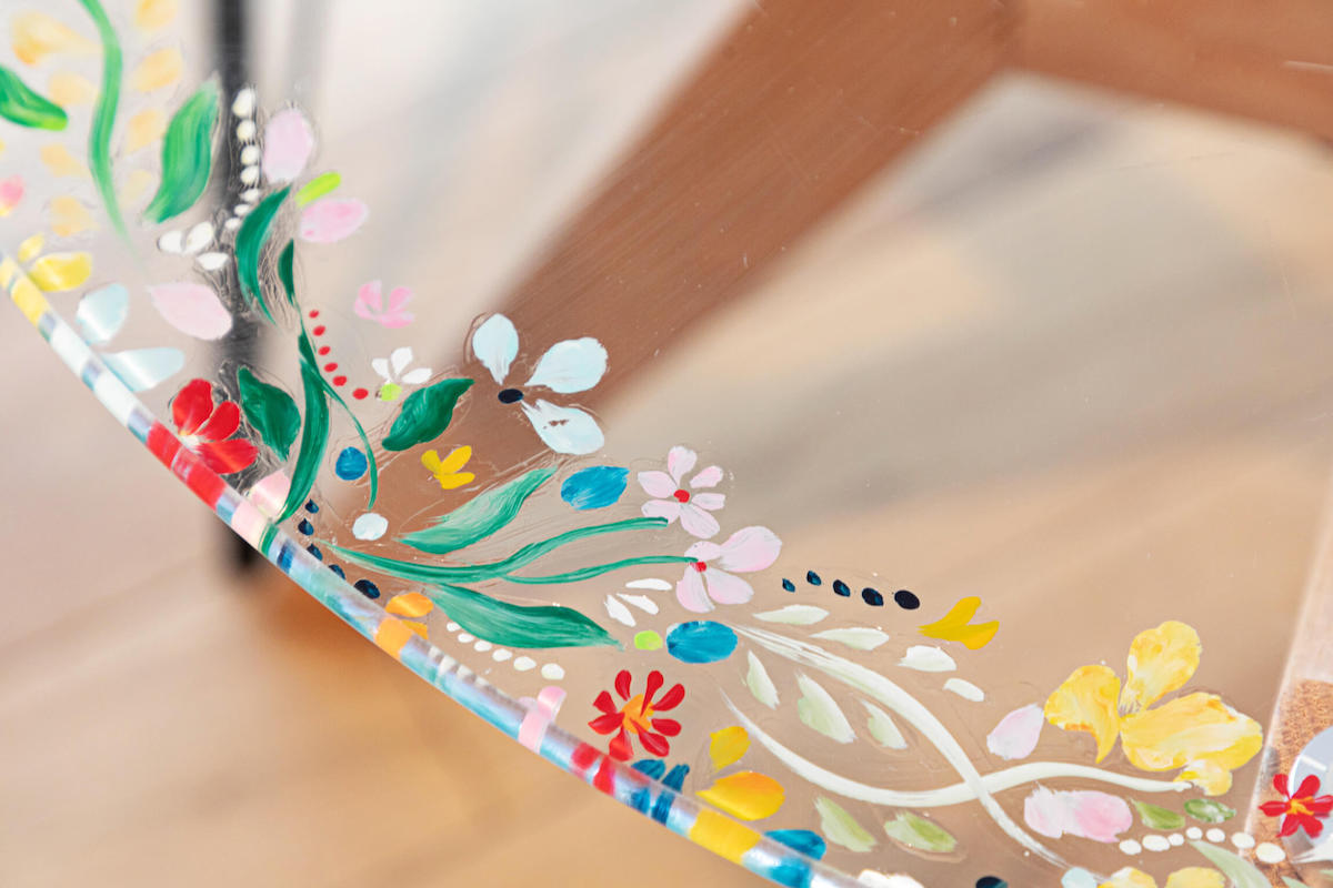 特に、SNSで「映える!かわいい!」と注目を集めているのが、店内に2つあるガラスのテーブル。色とりどりの花やリーフがあしらわれたテーブルは、モデル・俳優・アーティストとして活躍する倉中るなさんが、直接手描きしたもの。天板全面に柄が入ったものと、縁に描かれたものの2タイプがあります。