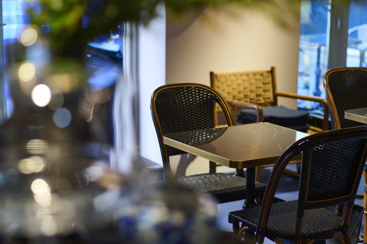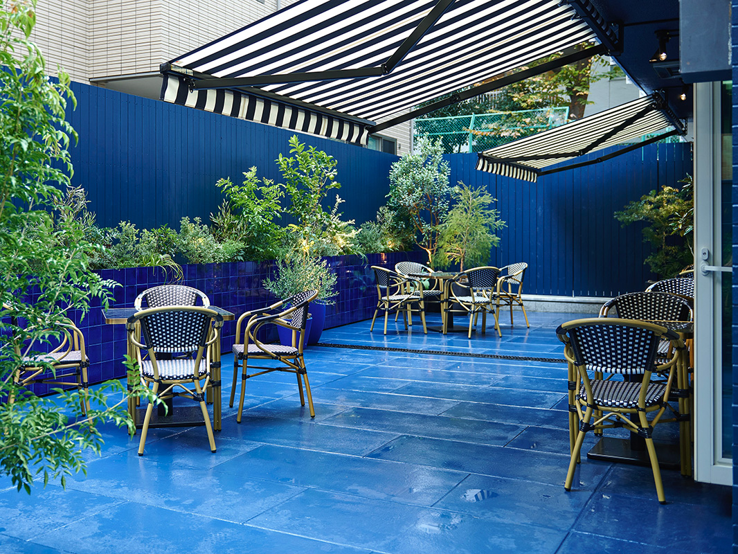 テラス席は、空間を涼やかに保つブルー&自然を感じる豊かなグリーンが、より旅の非日常感を演出。天気がいい日は、ぜひテラス席を利用してみて。