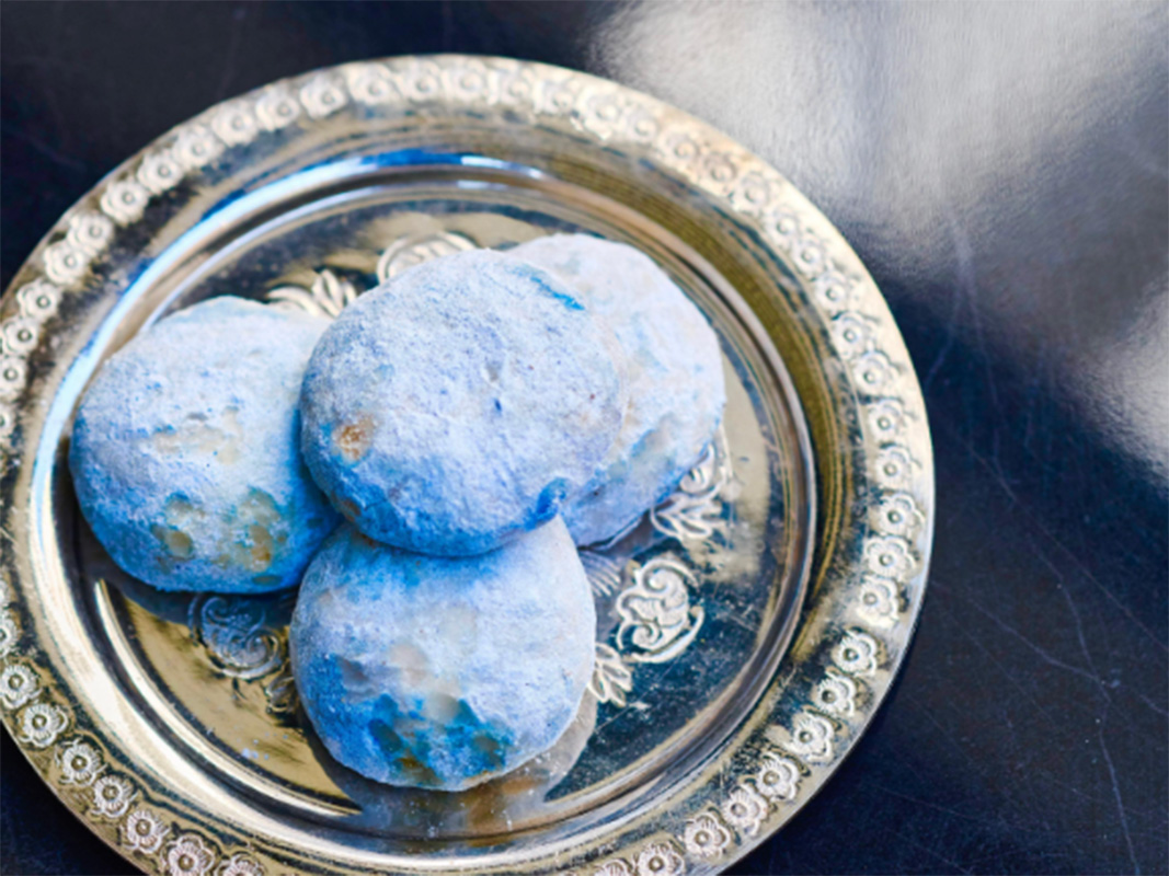 「ブルーポロボローネ」は、スペインの郷土菓子である「ポロボローネ」をアレンジしたもの。鮮やかなブルーは、「ブルースピルリナ」による色づけです。
