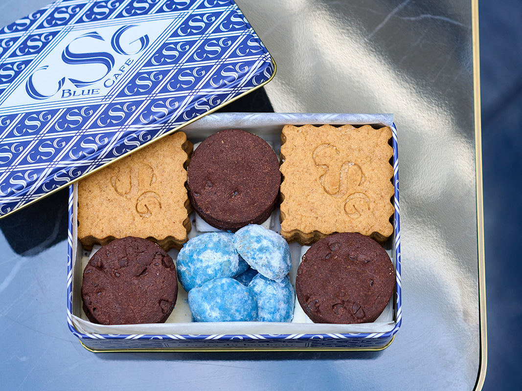 蓋を開けると、塩バター胚芽クッキー、カカオスパイスクッキー、ブルーポロボローネの3種類がぎっしり。
