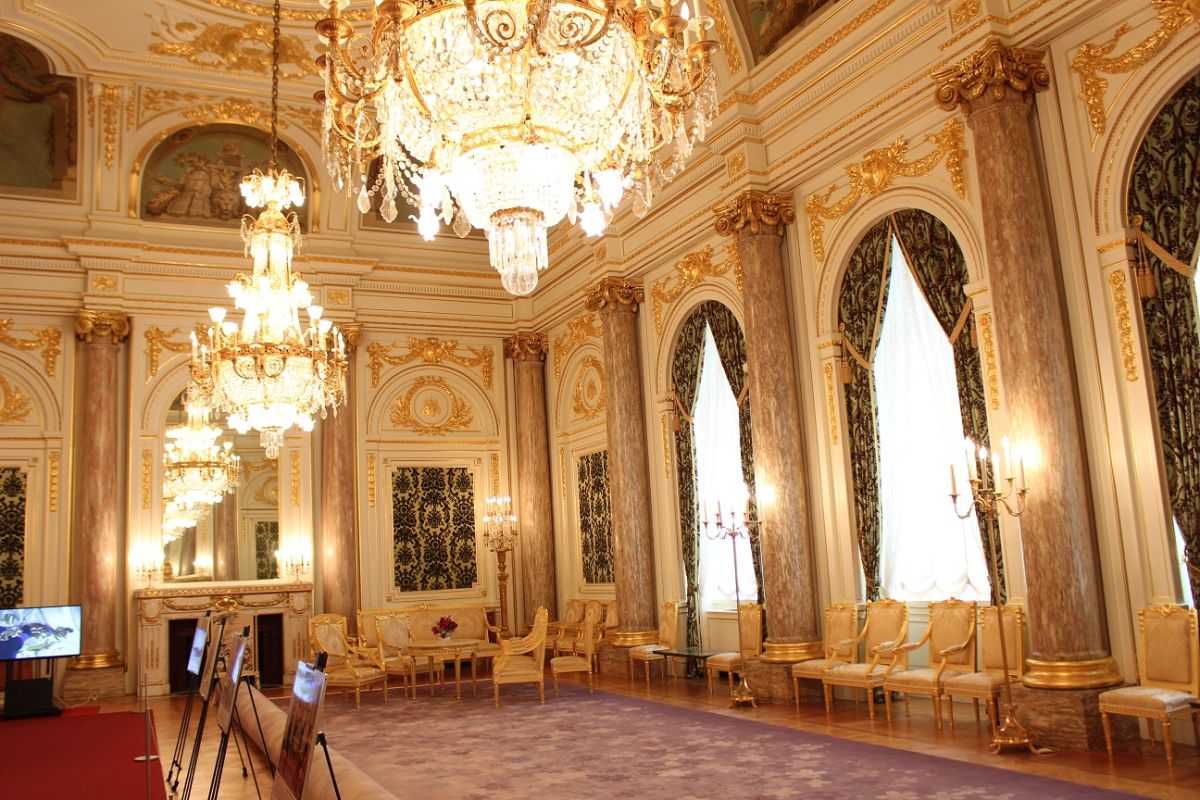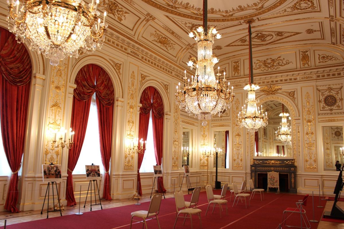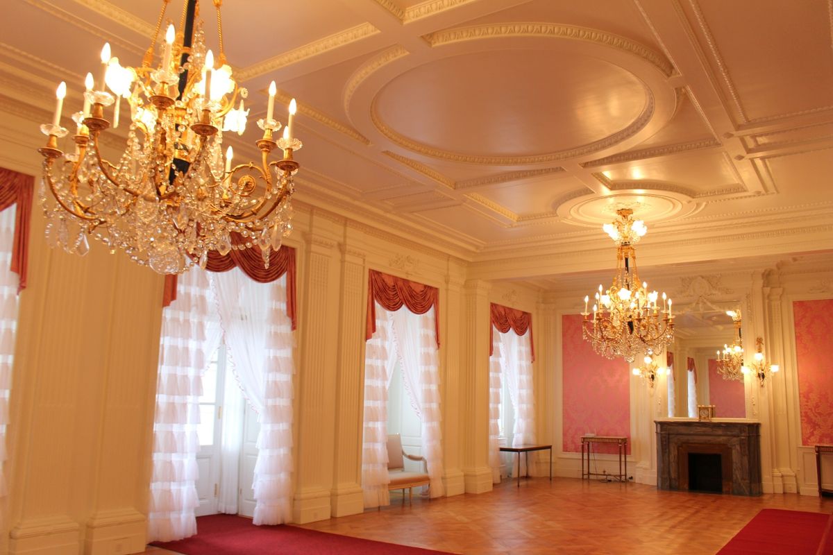 かつて”舞踏室”といわれており、館内で最も大きなシャンデリア3基に照らされた室内では、あちこちに楽器やマスカレードのモチーフを見つけることができます。現在では、屋外で行う予定だった歓迎式典を雨の日に行うときの場などにも使われています。