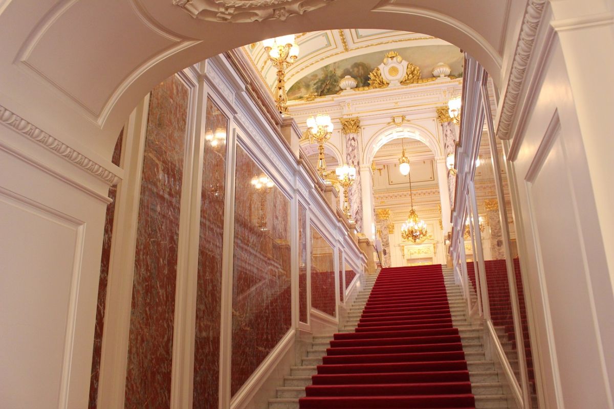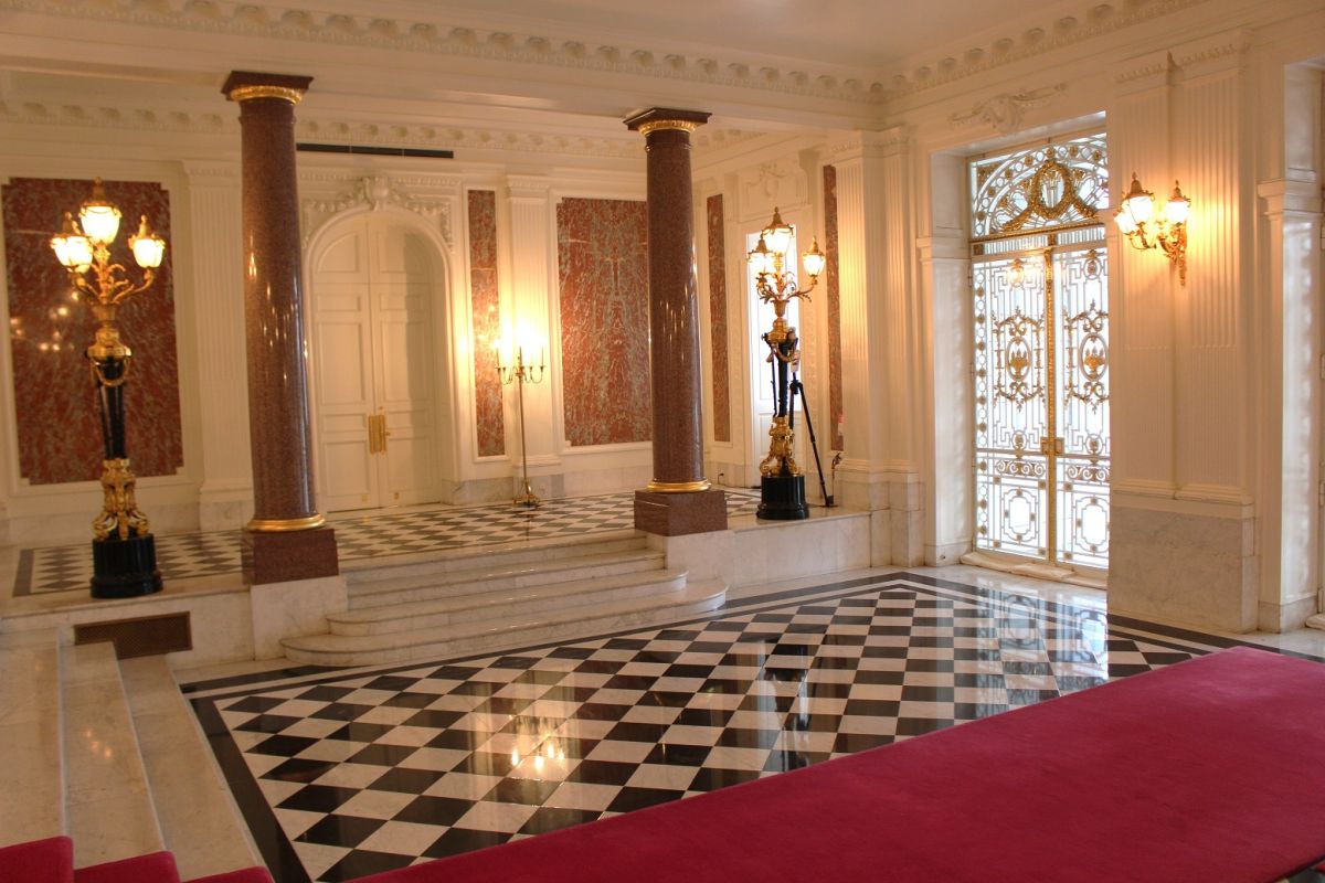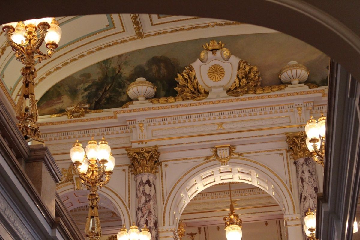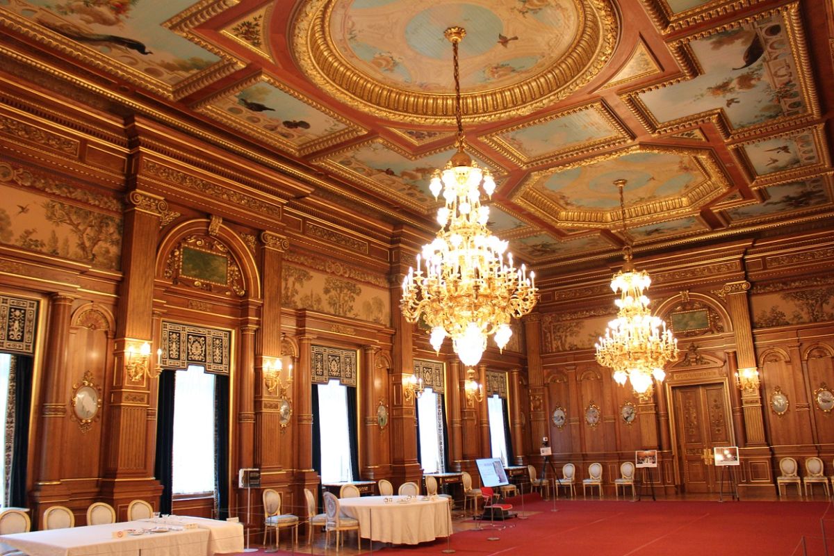 かつて”舞踏室”といわれており、館内で最も大きなシャンデリア3基に照らされた室内では、あちこちに楽器やマスカレードのモチーフを見つけることができます。現在では、屋外で行う予定だった歓迎式典を雨の日に行うときの場などにも使われています。