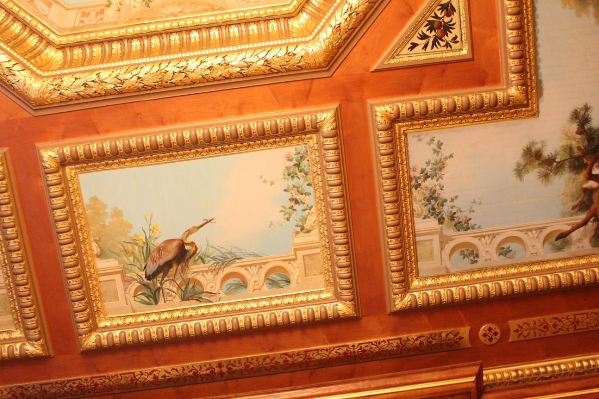 そのまま頭上を見ると、フランス人画家による花鳥の画が。和と洋でとらえ方の違う花鳥を見比べてみましょう。また、天井の画は現在進行形で修復中。よく見ると、修繕が終わったものとそうでないものが分かりますよ。