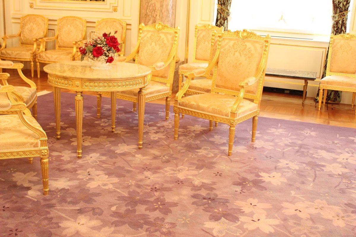 天井画の修復や新調されたカーテンなどはもちろんですが、特に注目なのが床に敷かれているこちらの緞通(だんつう)。47種の糸を使い分けることで繊細な桜花の色合いを表現していますが、これを再現するために、今回1万6時間が費やされたのだとか。1271人もの職人の手によって丁寧に織り上げられたまさに一級品です。