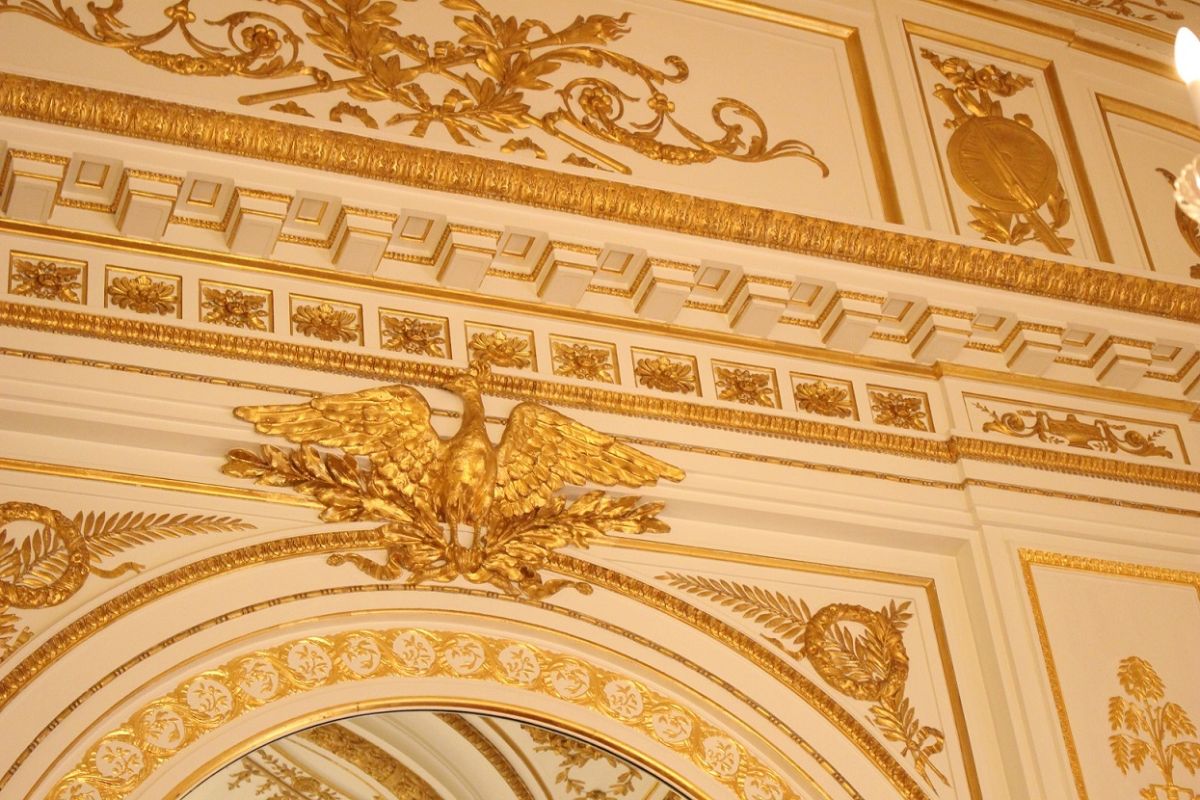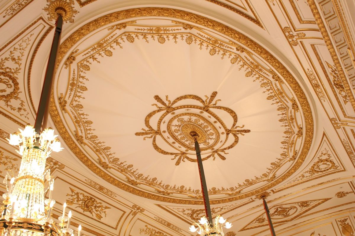 ナポレオンの時代に発展した、アンピール様式でまとめられた室内。野戦テントの天幕をイメージさせる天井は、テントの布の質感を出すため、しわのような凹凸がついています…!