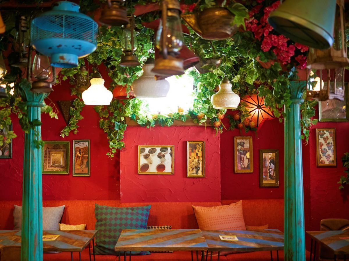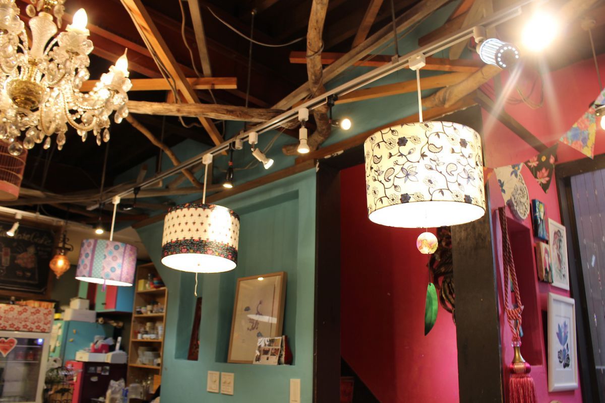 店内は、カラフルで個性的な内装!模様がかわいいランプやシャンデリア風のライトなど、こだわりのインテリアにも注目です。