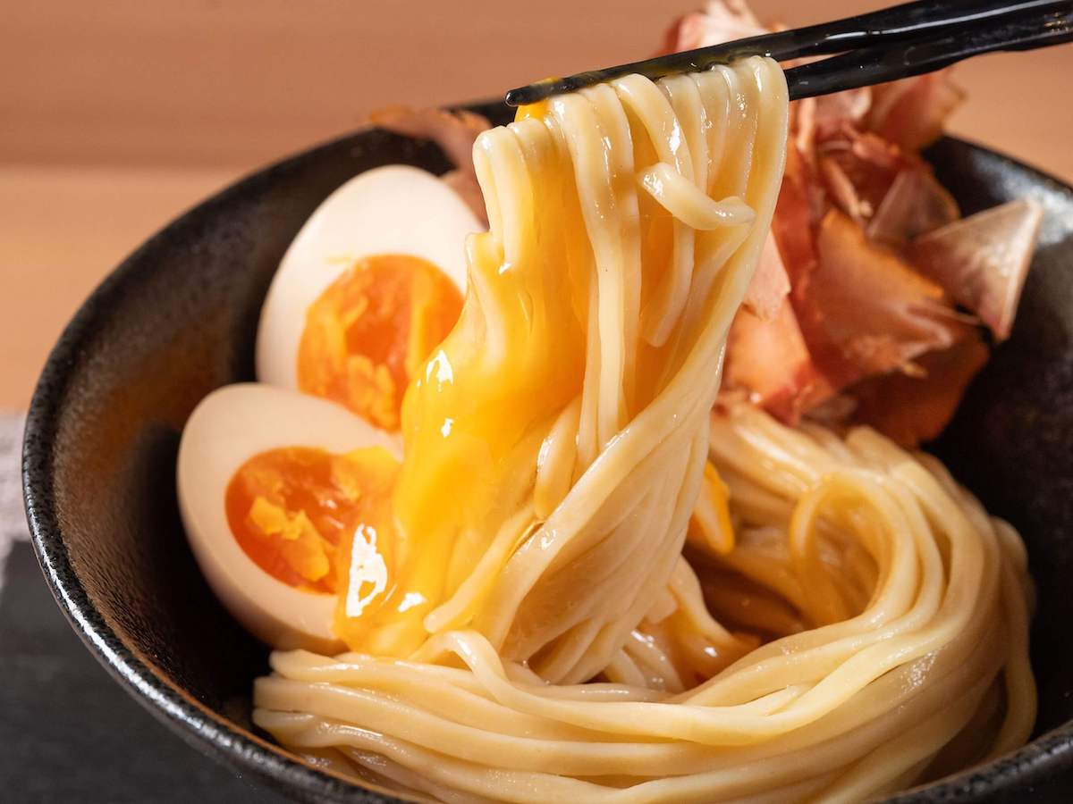 だしのうまみを含み濃厚さとコクをまとった全卵は、モチモチ&ツルツルの太麺とベストマッチ。