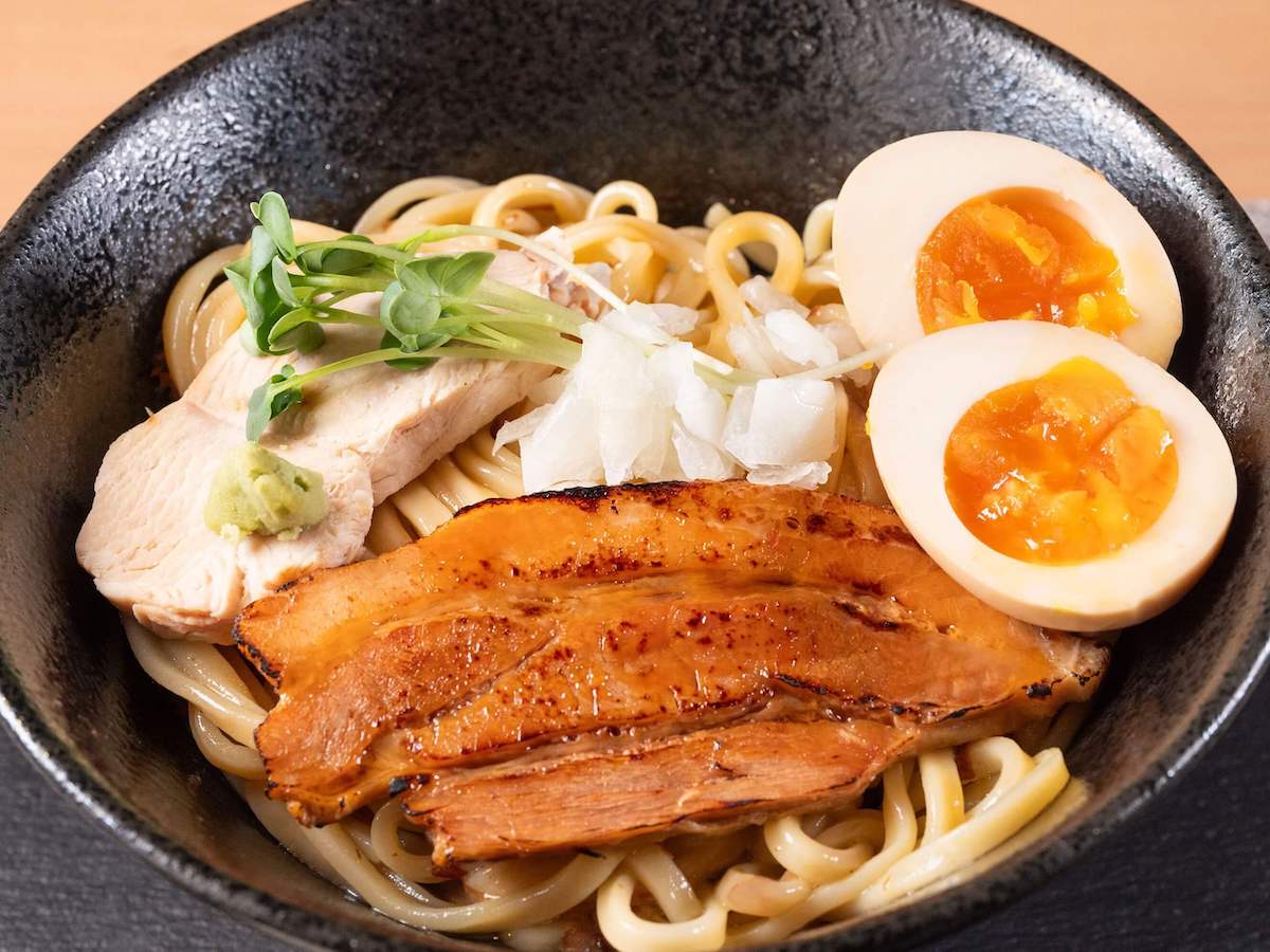 和のうまみが詰まった濃厚なつけ汁に、中華太麺のさっぱりとしたたまごかけ麺が絡んで実に美味~♪ ある程度食べ進めたら、カイワレ大根や卓上の黒コショウを使って味を変化させると、おいしさがぐっと引き立ちますよ。