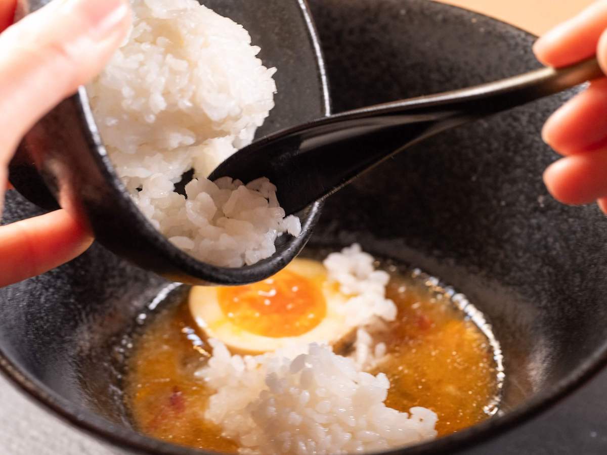「特製たまごかけ麺」のお楽しみは、麺を完食した後もまだまだ続きます!器に残ったうまみ満載のだし汁にセットの小ライスを加えると…