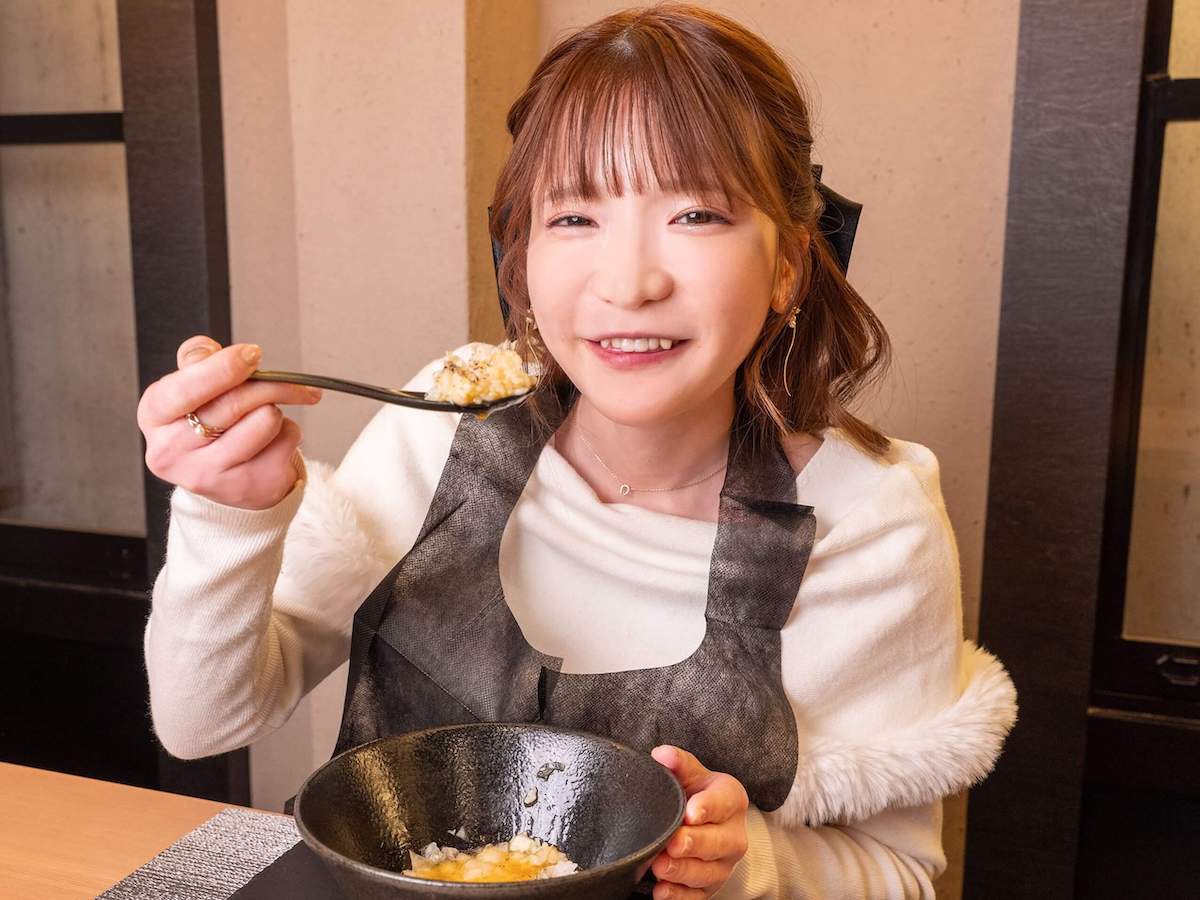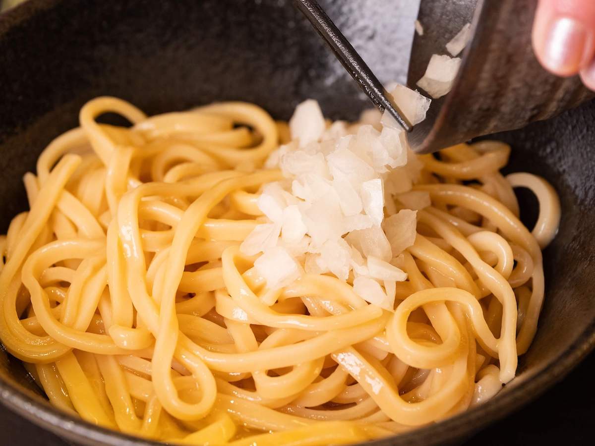 食べ方は先ほどと同様に、まずは“たまごかけ麺”作りから始めましょう!空気を含ませ軽やかに全体が混ざったら、このタイミングでみじん切りのタマネギを加えるのが、もえあず流です。最初に麺に混ぜておくことで、食感だけでなくタマネギの辛みや甘みがよりダイレクトに伝わるんです。