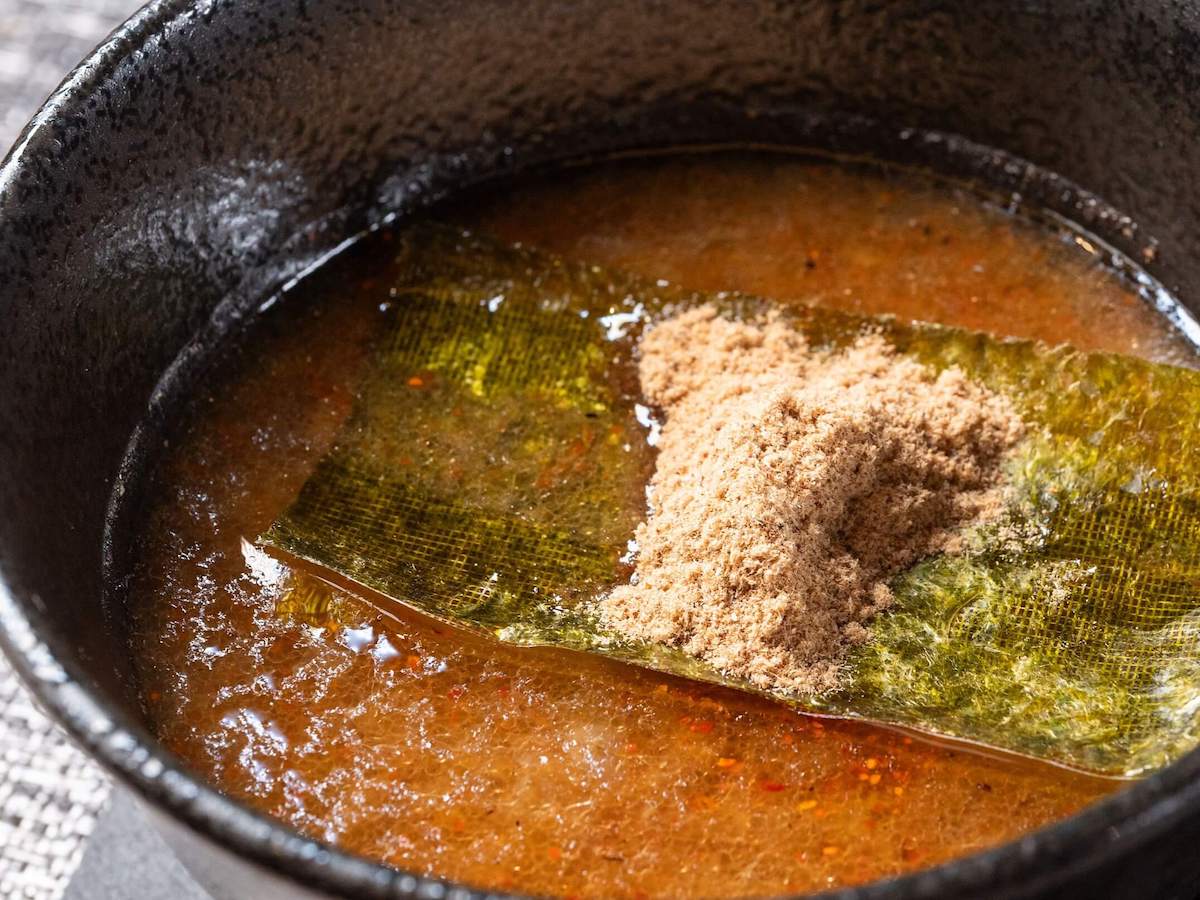 カツオ・宗田節・煮干し・昆布からとった一番だしを、ほうじ茶で割ったオリジナルブレンドのスープ割も楽しみのひとつです。