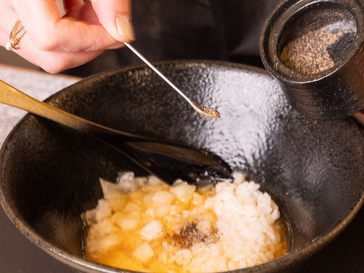 セットに付属しているタマネギのみじん切りや卓上に用意された黒コショウをプラスして、味変するのもおすすめ。