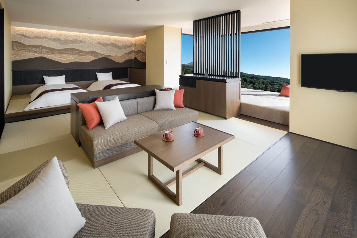 界 霧島の客室はすべて、地域の特徴をいかしたご当地部屋「薩摩シラス大地の間」。全客室から桜島や錦江湾を見渡す壮大な景色を望むことができます。また、客室の設えは、薩摩和紙や大島紬などが取り入れてられており、地域の魅力を感じることができます。