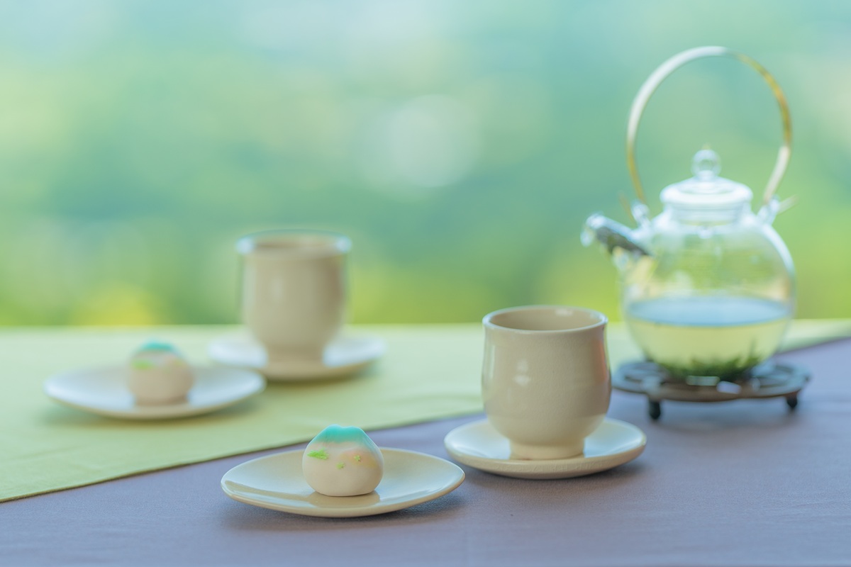 オプションとして、鹿児島県姶良(あいら)市にある御菓子司「あじ福」による界 霧島オリジナル上生菓子と、霧島茶のセット「茶一杯(ちゃいっぺ)」1000円を楽しめます。優しい口当たりとほのかな甘みが特徴の煎茶は、春の陽気になぞらえて選定しているのだとか。