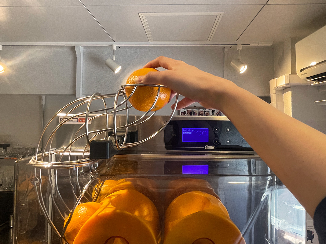 注文後、店員さんからオレンジを受け取り、自分でジューサーに入れます。目の前でオレンジが搾られていく過程に、ワクワクが止まりません。