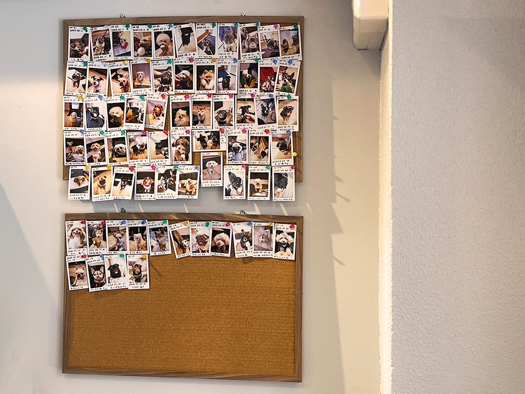 壁には、これまでに遊びに来てくれたかわいいお友だちの写真がずらり。あなたの愛犬も、仲間入りできるかも!?