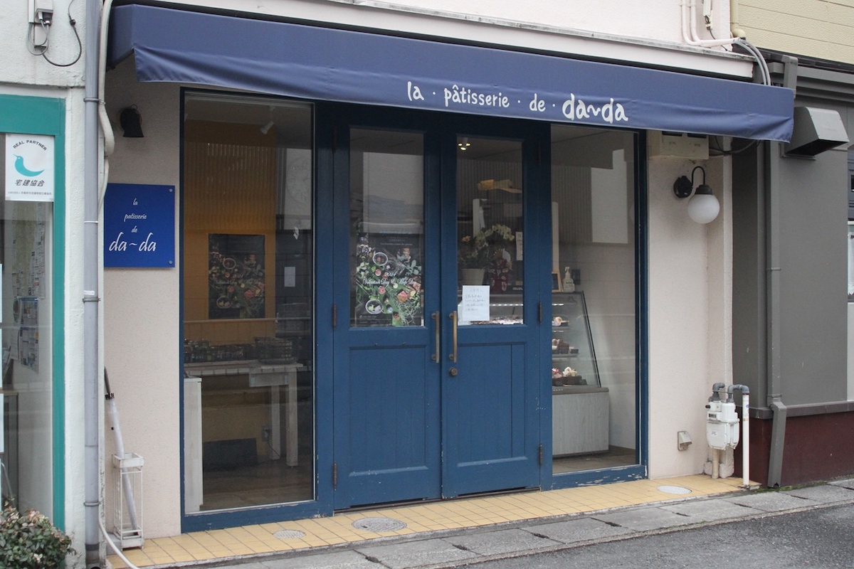 「la patisserie de da~da」があるのは、阪急嵐山線上桂駅徒歩1分のところ。西改札口を出て、左に進むと見えてくる青い扉が目印です。