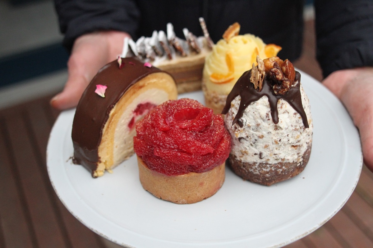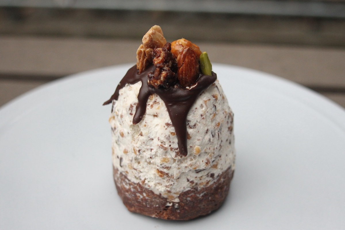 オープン当初から人気の「ズコット」820円は、アーモンドやヘーゼルナッツ、ピスタチオなどのナッツ類がぎっしりと入ったドーム型のケーキ。タルトとパイの間のような生地の食感もおもしろく、「こんなの初めて!」が味わえます。