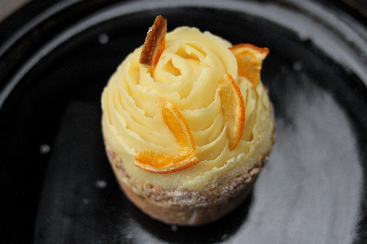 「紅はるかのモンブラン」830円は、バラの花のような絞りが特徴的。サツマイモは糖度の高い紅はるかを使用していて、しっかり甘みが感じられます。さわやかな風味のドライオレンジがいいアクセントに。中のクリームもいろいろな味わいが複雑に絡み合い、食べるたびに違う味が楽しめます。