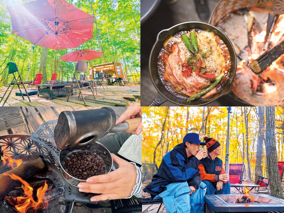 2024年2月オープンの「グランピングカフェ“たき火”」。全席たき火テラス席で、森林浴とカフェを同時に楽しめます。もちろん手ぶらでOK。おすすめは「たき火焙煎コーヒー」。 生豆から自身で焙煎し、世界で一つのオリジナルコーヒーが楽しめます。料理も本格的で、鉄鍋スキレットを使用した「たき火焼きカレー」のファンも多いそう。