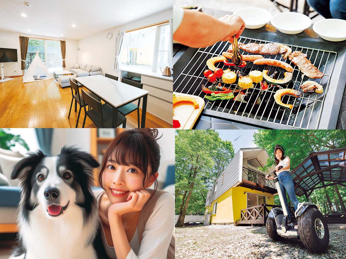 4棟のコテージヴィラが並んで立つイエローベースは、一棟完全貸切り。各棟に専用のBBQサイト、ウッドデッキが付いて機材も食材も無料です。大型犬を含めたペットとの宿泊もできます。ジャイロライド2台と森の天空サウナ&露天風呂も無料で利用できるので、アクティビティも森もお得に満喫するなら泊まるのが断然おすすめです。