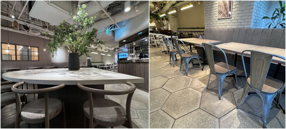 ゆったりと席が配置された店内は広々。落ち着いたグレーと、グリーンのコントラストが映えます。