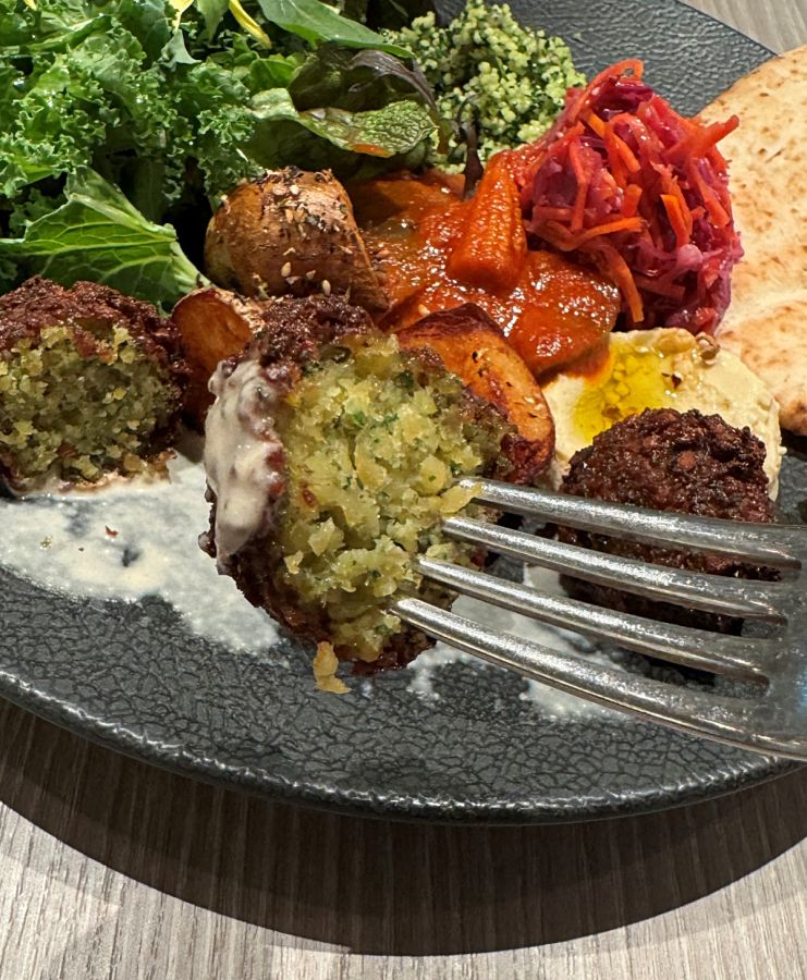 一般的なレシピでは「ファラフェル」はひよこ豆を潰し、スパイスやハーブを混ぜ込んで揚げていますが、「plant more」では緑豆を加えているのが特徴で、外はサクッと香ばしく、中はホクホクとした食感。