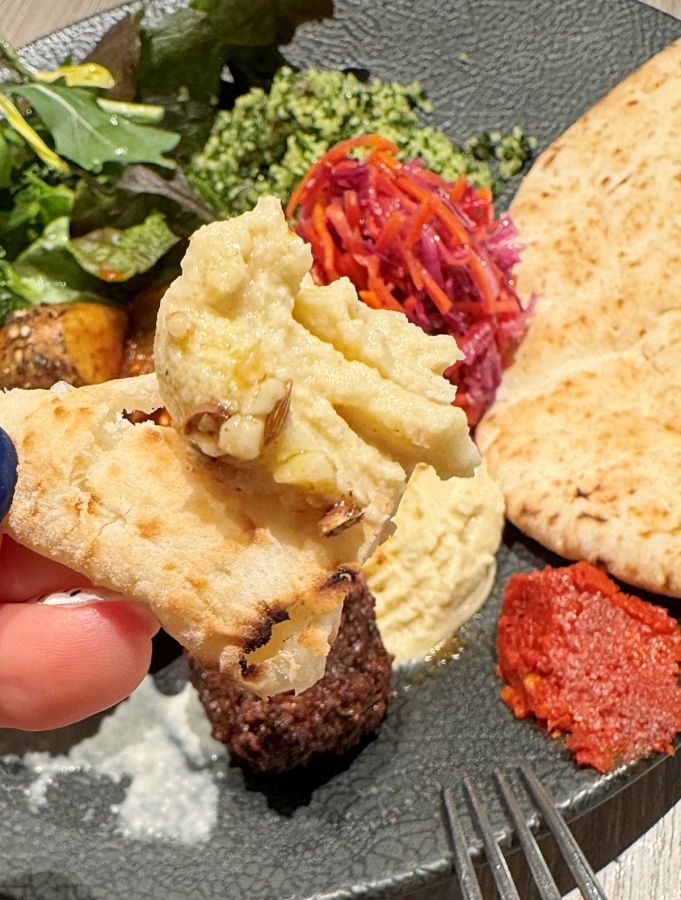 ピタパンにフムスを付けたり、サラダをはさんだり、このひと皿で色んな楽しみ方ができるのもうれしいポイント。