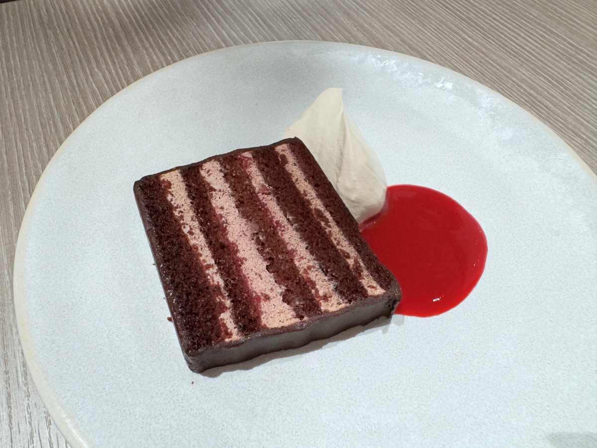 カカオのほろ苦さとフランボワーズの甘酸っぱさとのコントラストが絶妙です。添えられた豆乳クリームを付ければよりまろやかに、フランボワーズソースを絡めればさらにベリーの風味が際立ちます。