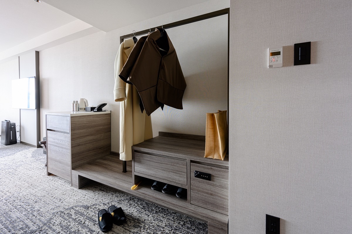 ハンガーラックにかかっているこちらは上から羽織れるポンチョタイプの防寒着。館内着でくつろぐ際や、夜に屋外の展望デッキへ出るときなどに1枚羽織る上着として活躍しそうです。