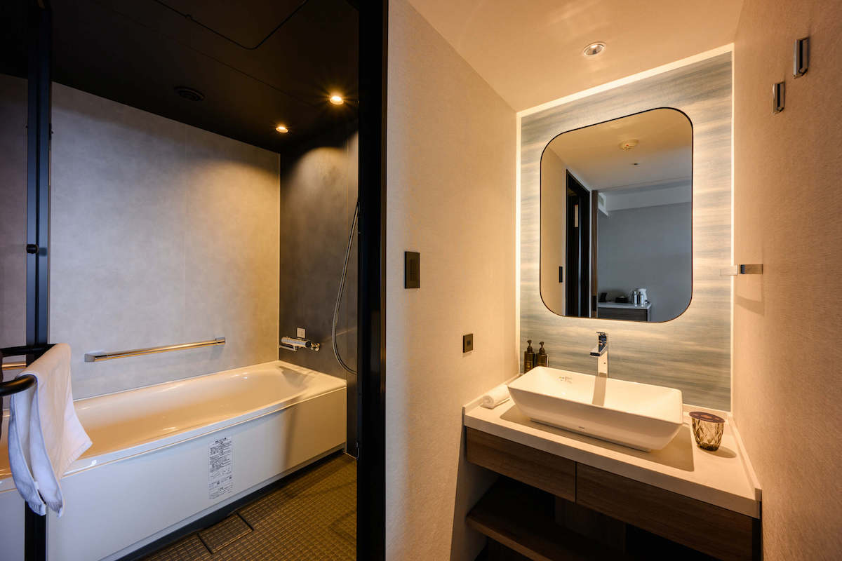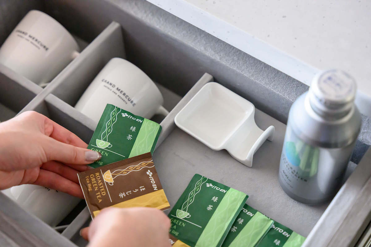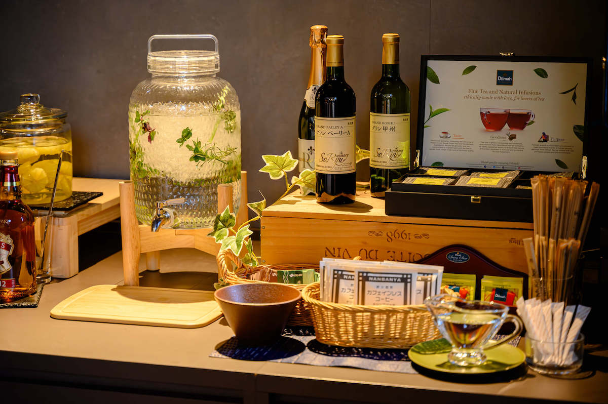 部屋には緑茶とほうじ茶のティーバッグの用意も。お部屋でくつろぎたい方はこちらでひと息ついてもいいですし、ほかのドリンクを飲みたい方は、フリーフローで楽しめるラウンジやレストランのドリンクを味わってもいいですね。
