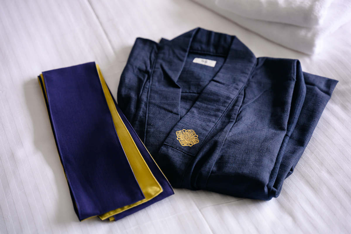 館内着は紺色の浴衣タイプ。胸元には、水引をベースに菊のお花と富士山をイメージした、日本の「グランドメルキュール」モチーフの刺繍があしらわれています。紺色と黄色を基調にした落ち着いた色味で、男女ともに似合いそうなシンプルで上品なデザイン。