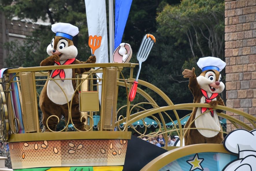 このほか、パレードにはミッキー、ミニー、デイジーなどおなじみのキャラクターのほか、『三人の騎士』という映画でドナルドと共演した、ホセ・キャリオカとパンチートも参加。みんなでドナルドを褒めたたえます。