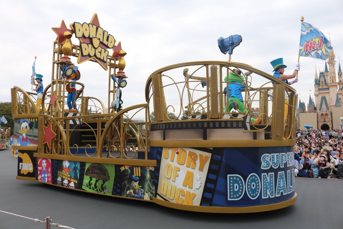 シンデレラ城前にはほかのフロートが来る前に到着して、プレショーも開催してくれますよ。その後、ドナルドをたたえる一員としてパレードにも参加します。